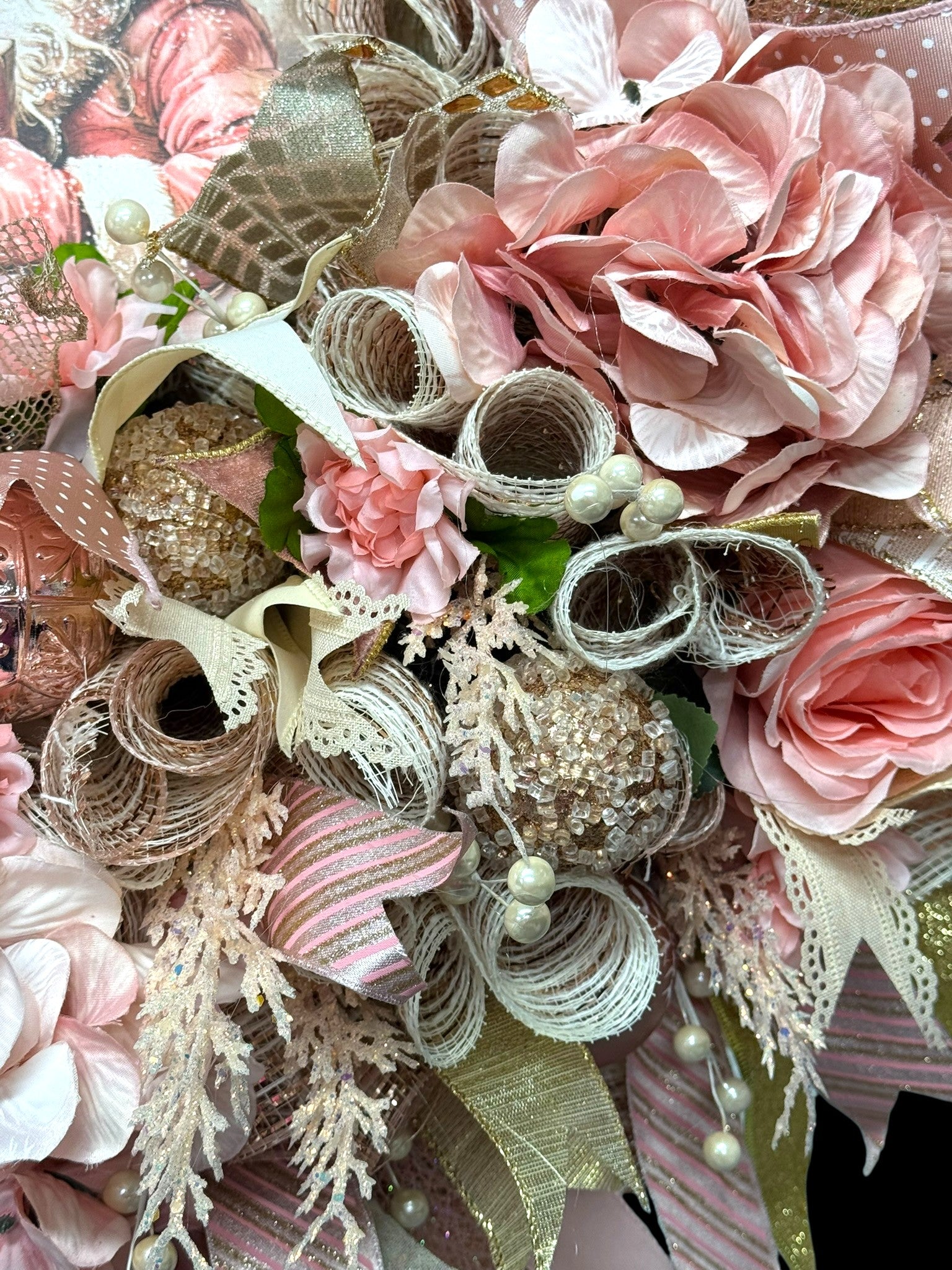 Pretty in pink and gold! This pink Victorian Santa wreath, by Christmas Plus More is beautiful with its festive Pink Roses, Hydrangeas, White Pine Picks, and Pearls The wreath contains pink and gold complimentary ribbons. It measures 26x26x8 inches and is a handmade creation by Christmas Plus More.