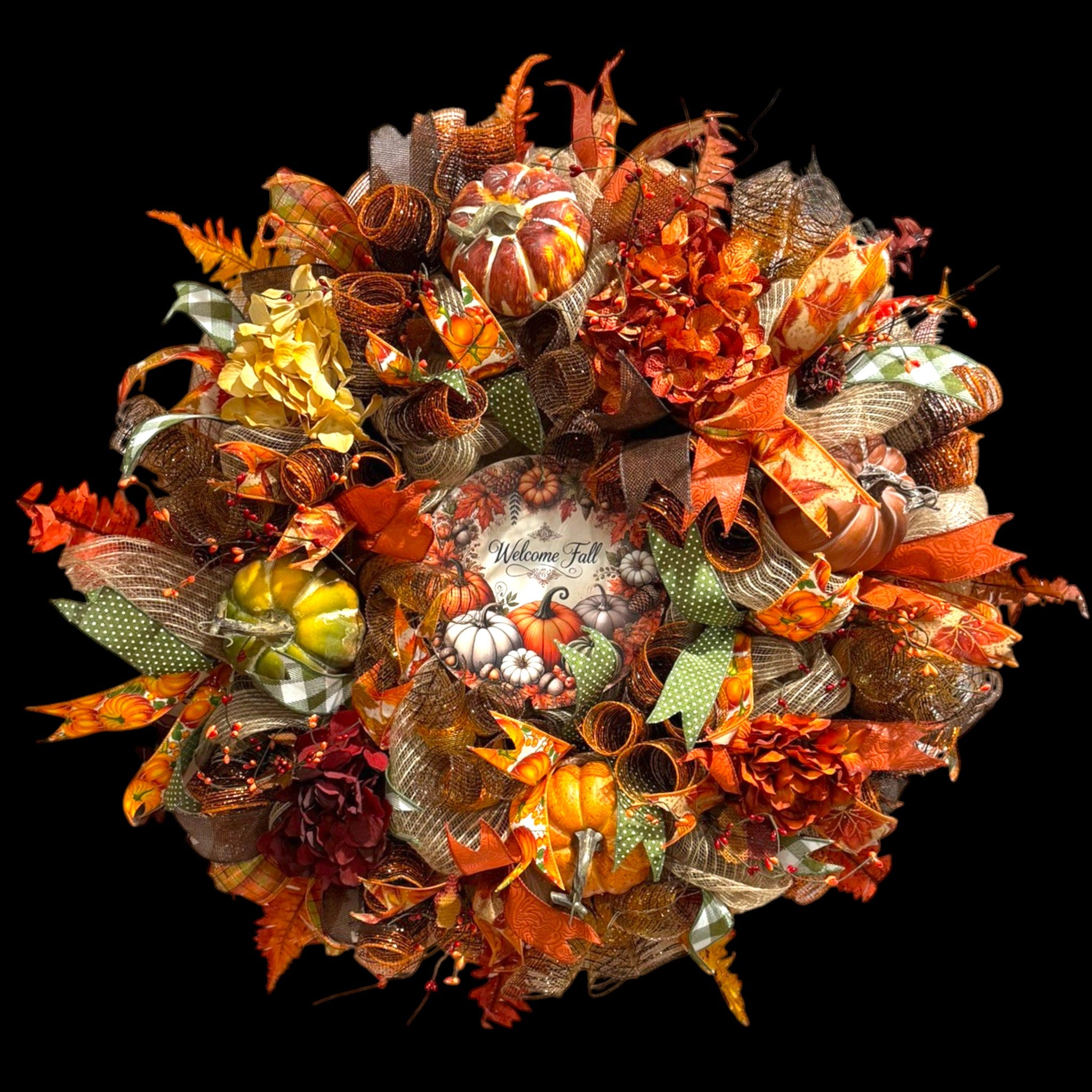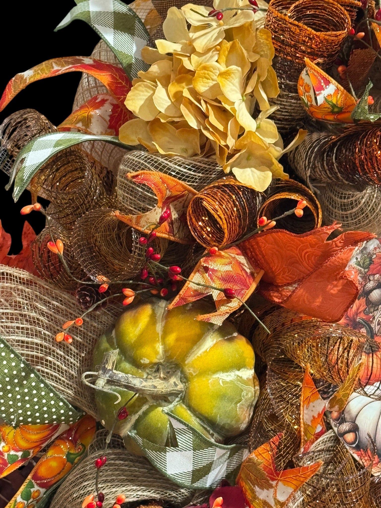 Not into Halloween? Beautiful and Country Farmhouse Fall Wreath. A Floral Artist created Front Door Wreath made of fall ribbons, deco mesh, pumpkins with artificial fall hydrangeas This wreath measures 27 inches x 27 inches.