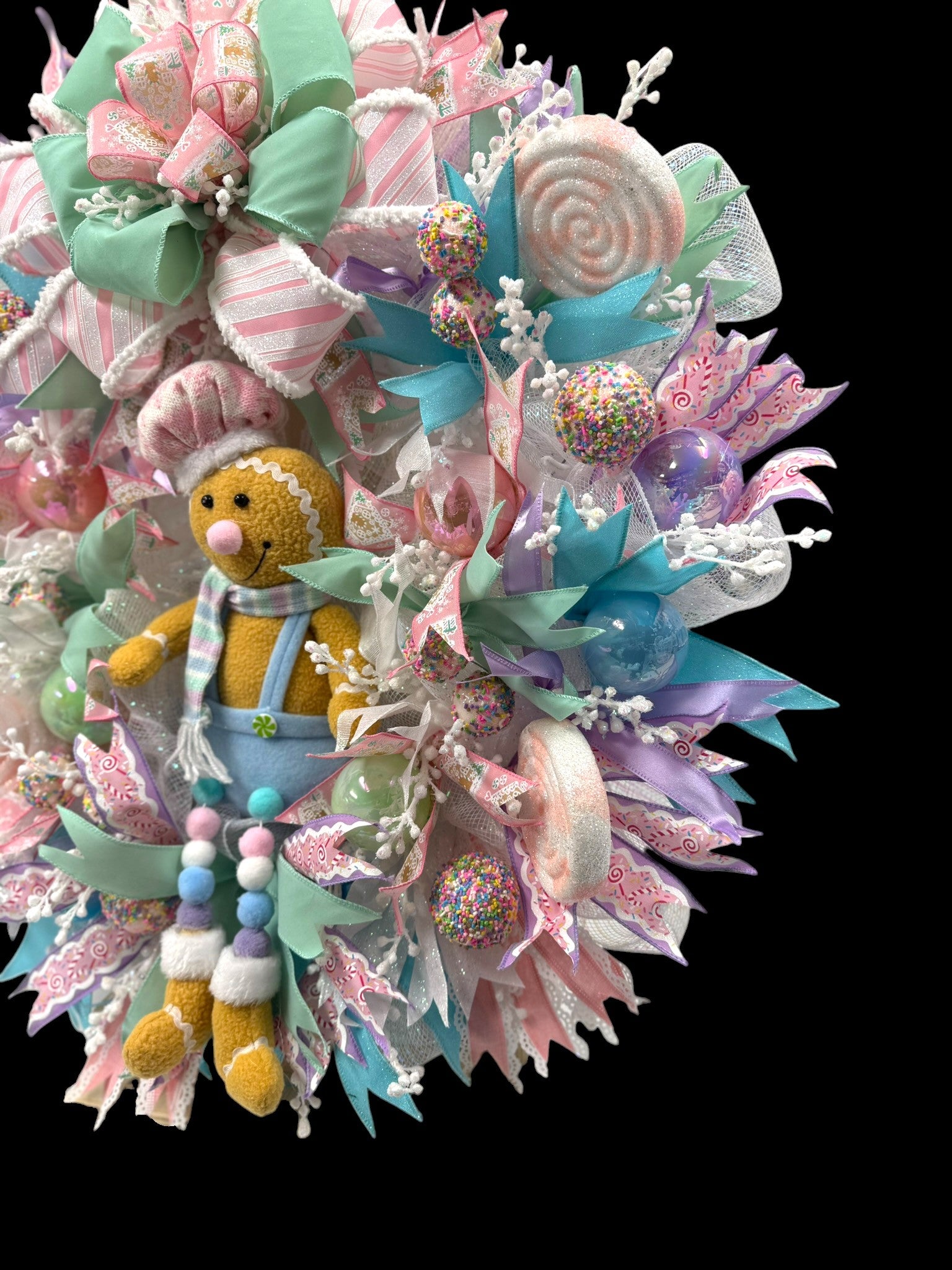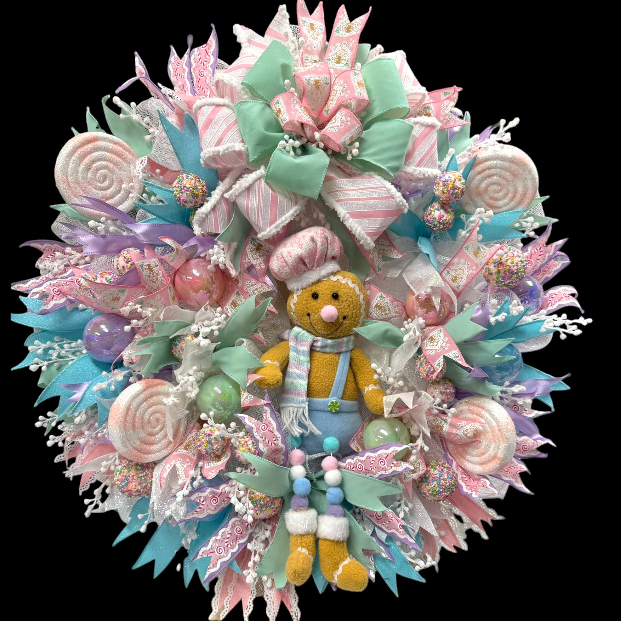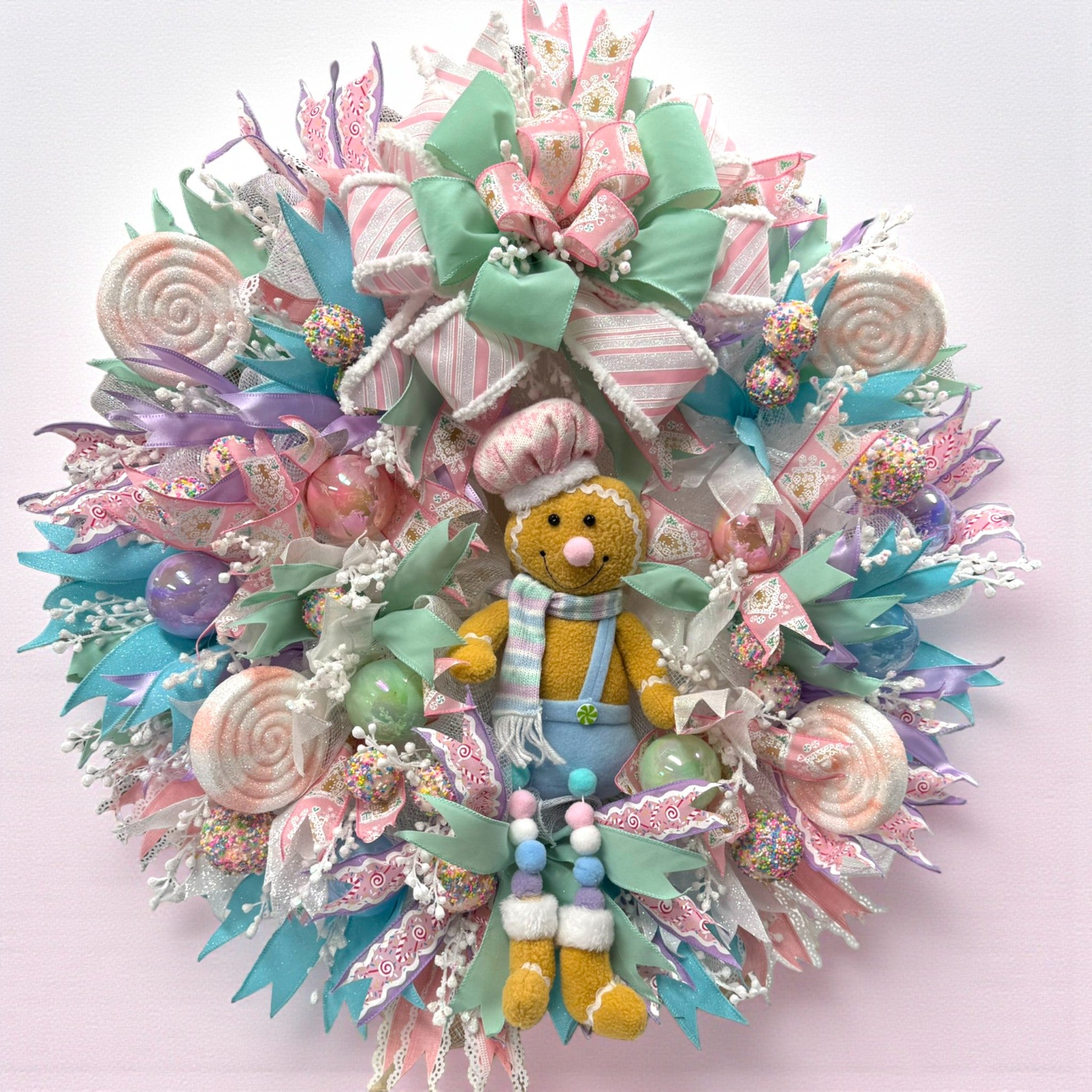 Crafted by Christmas Plus More, this handmade 27x27x6 inch wreath brings soft, sophisticated charm to your holiday décor. Featuring a charming gingerbread man adorned with a pink hat, delicate pastel candy accents, an elegant gingerbread house bow, and soft-hued ornaments complemented by white berry picks, it's a refined take on festive tradition. Each piece is carefully constructed to deliver maximum visual impact.