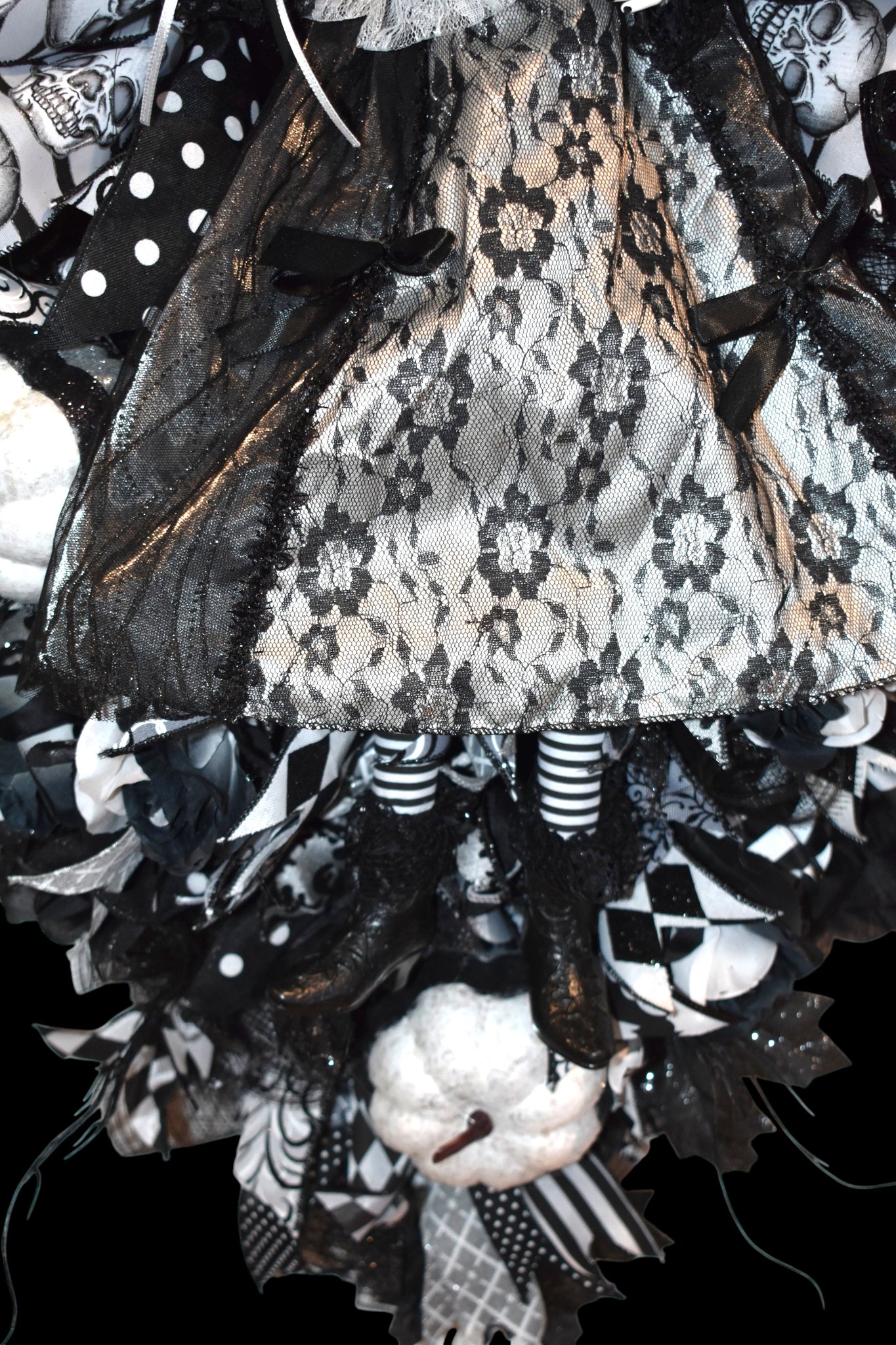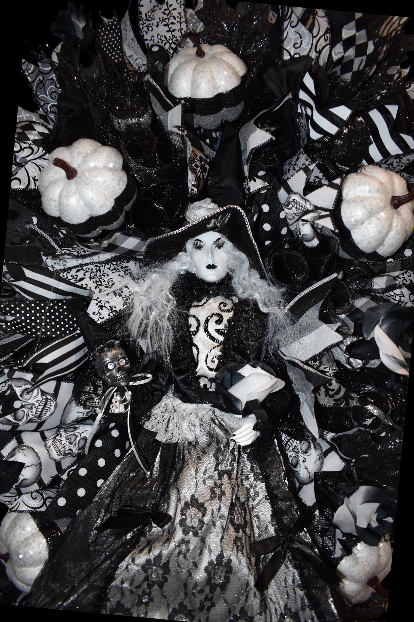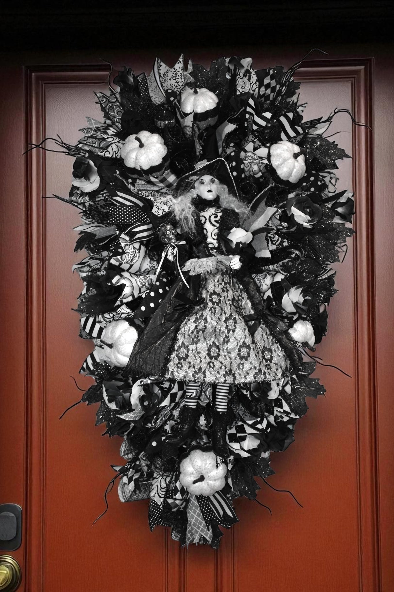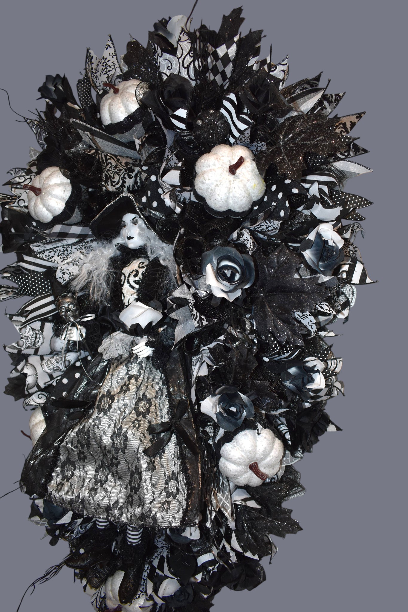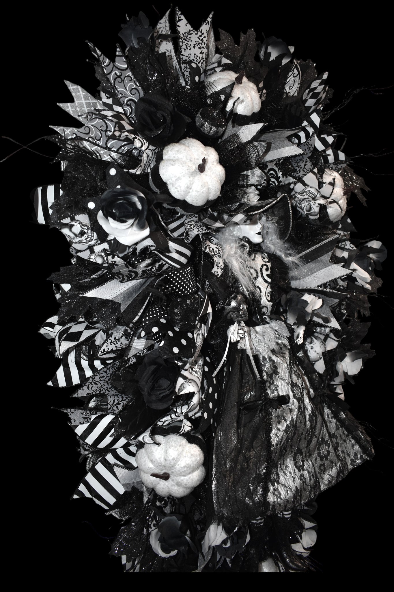 Photos do not do justice to this beautiful Halloween White Ghost Witch Swag Wreath, it is a festive and spooky addition to your front door decor. This black & white swag wreath features a witchy theme, perfect for celebrating the occasion. It stands at 42 inches tall and 22 inches wide x 7 inches, making it a striking statement piece for your home during the Halloween season. This wreath is sure to delight guests and bring a touch of Halloween cheer to your home.