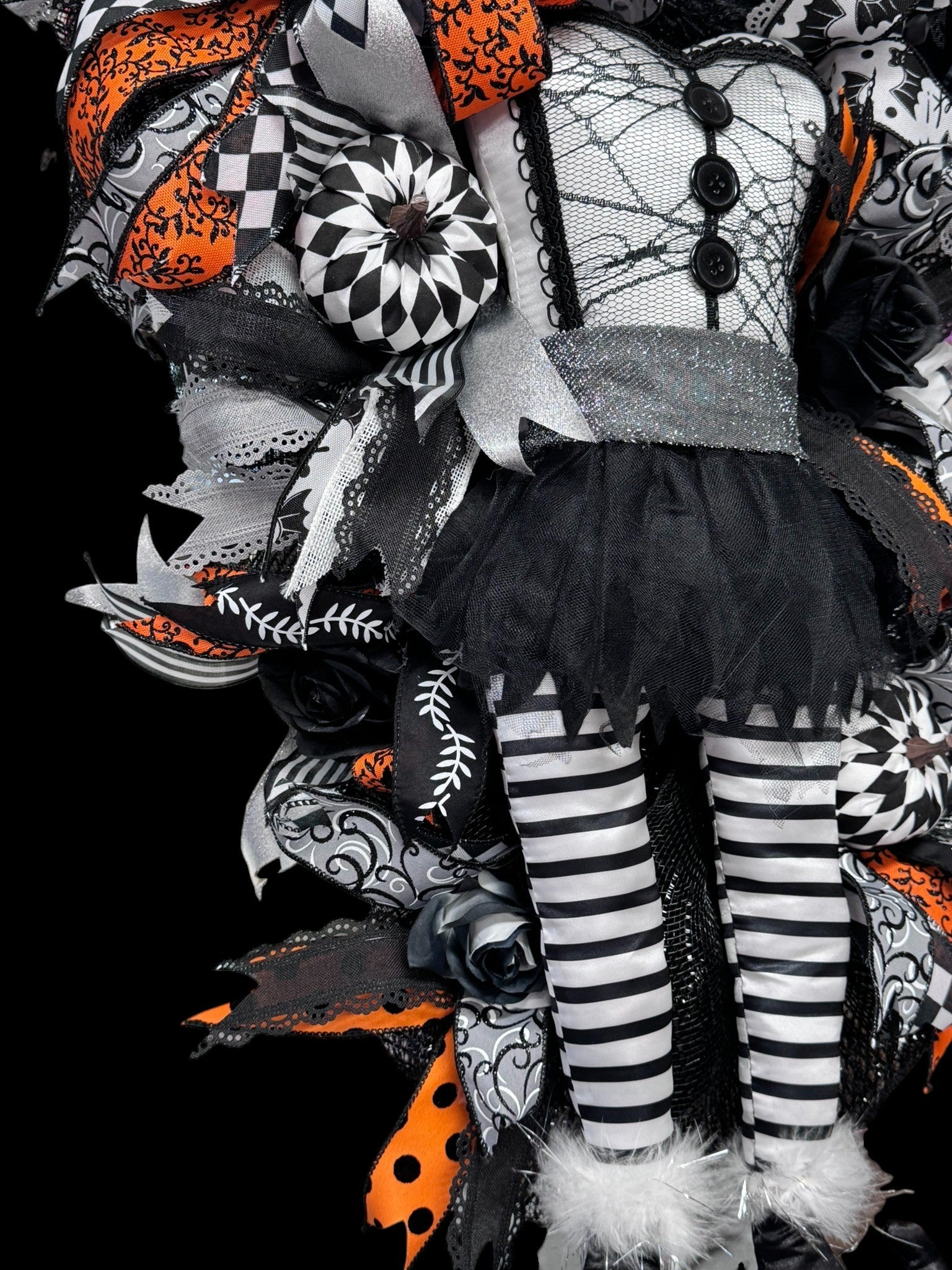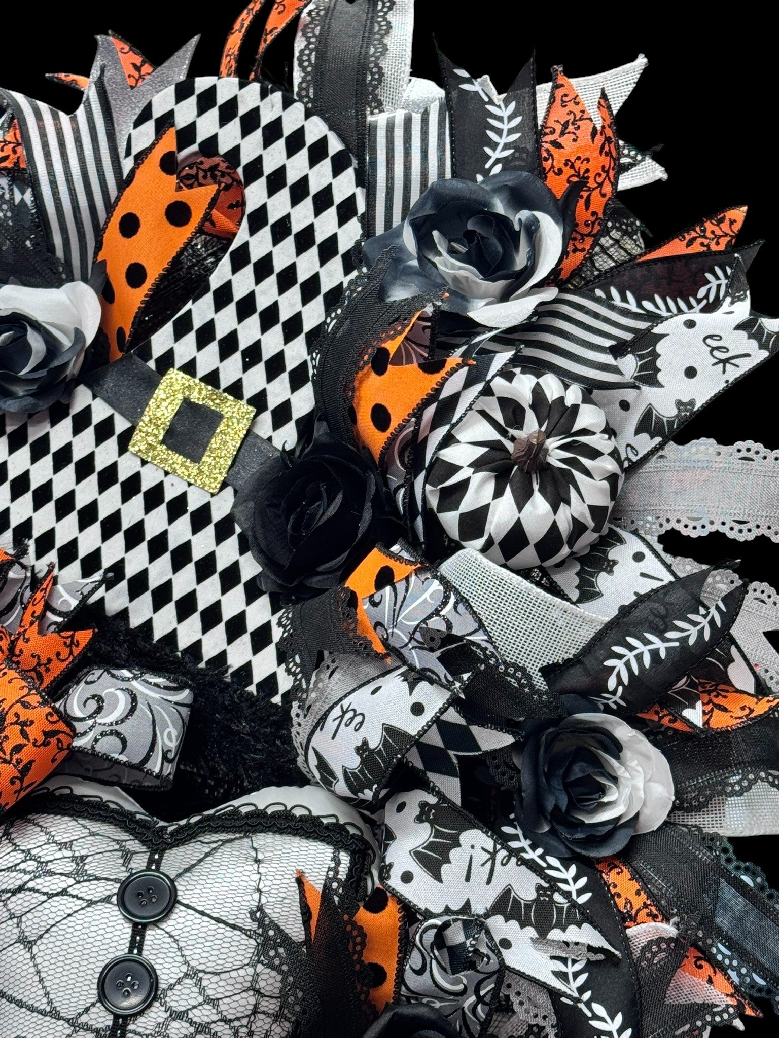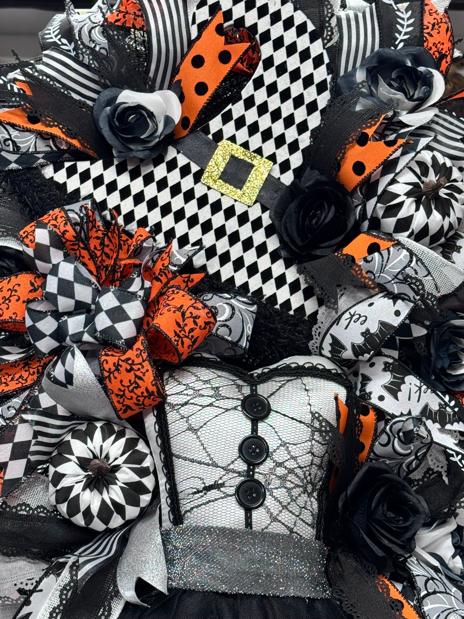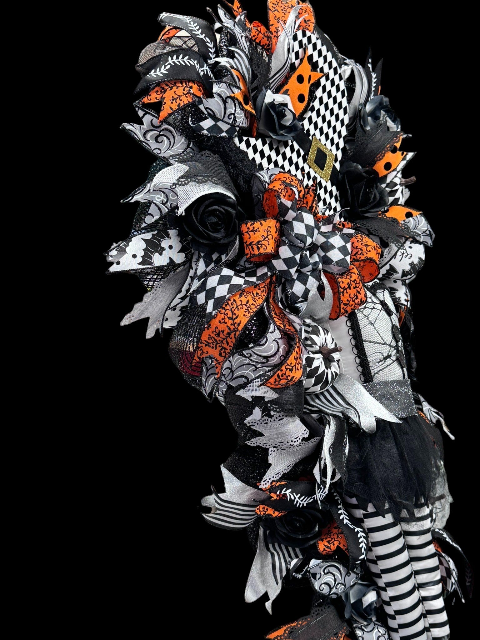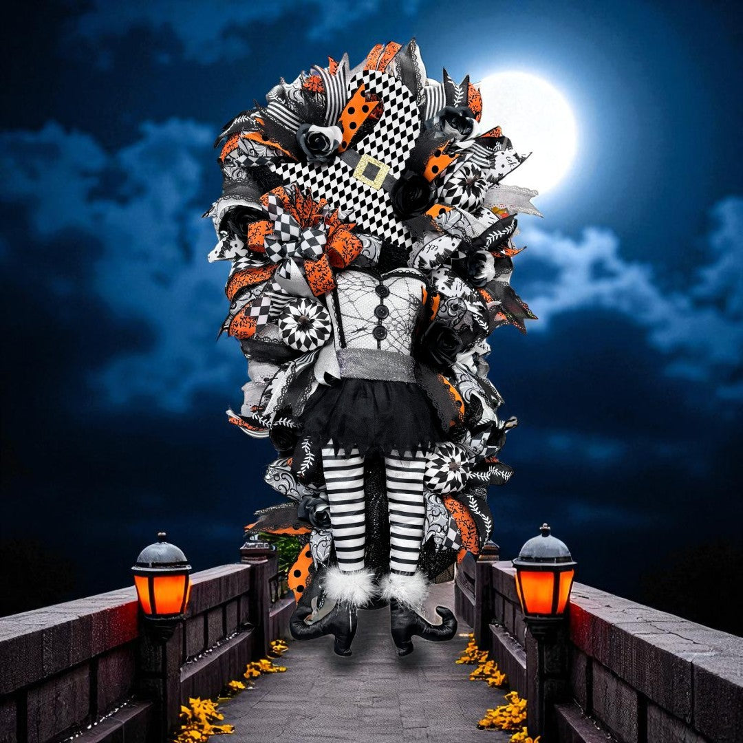 The Halloween Witch Wreath is a festive and spooky addition to your front door decor. This orange & black wreath features a witchy Mrs. Frankenstein theme, perfect for celebrating the occasion. Handmade in the United States, this wreath stands at 35 inches tall and 19 inches wide x 6 deep, making it a striking statement piece for your home during the Halloween season. This wreath is sure to delight guests and bring a touch of Halloween Witchy cheer to your home.