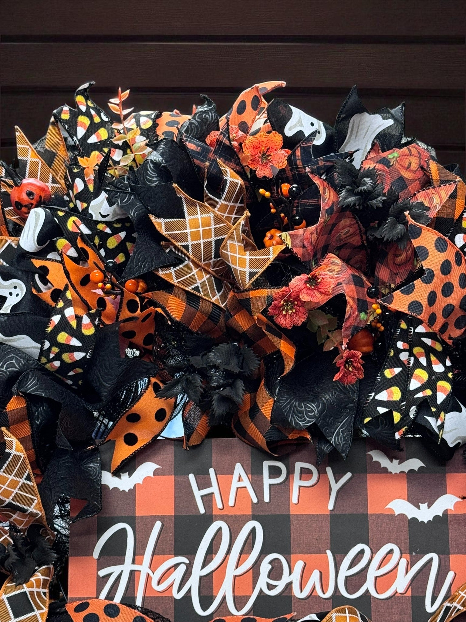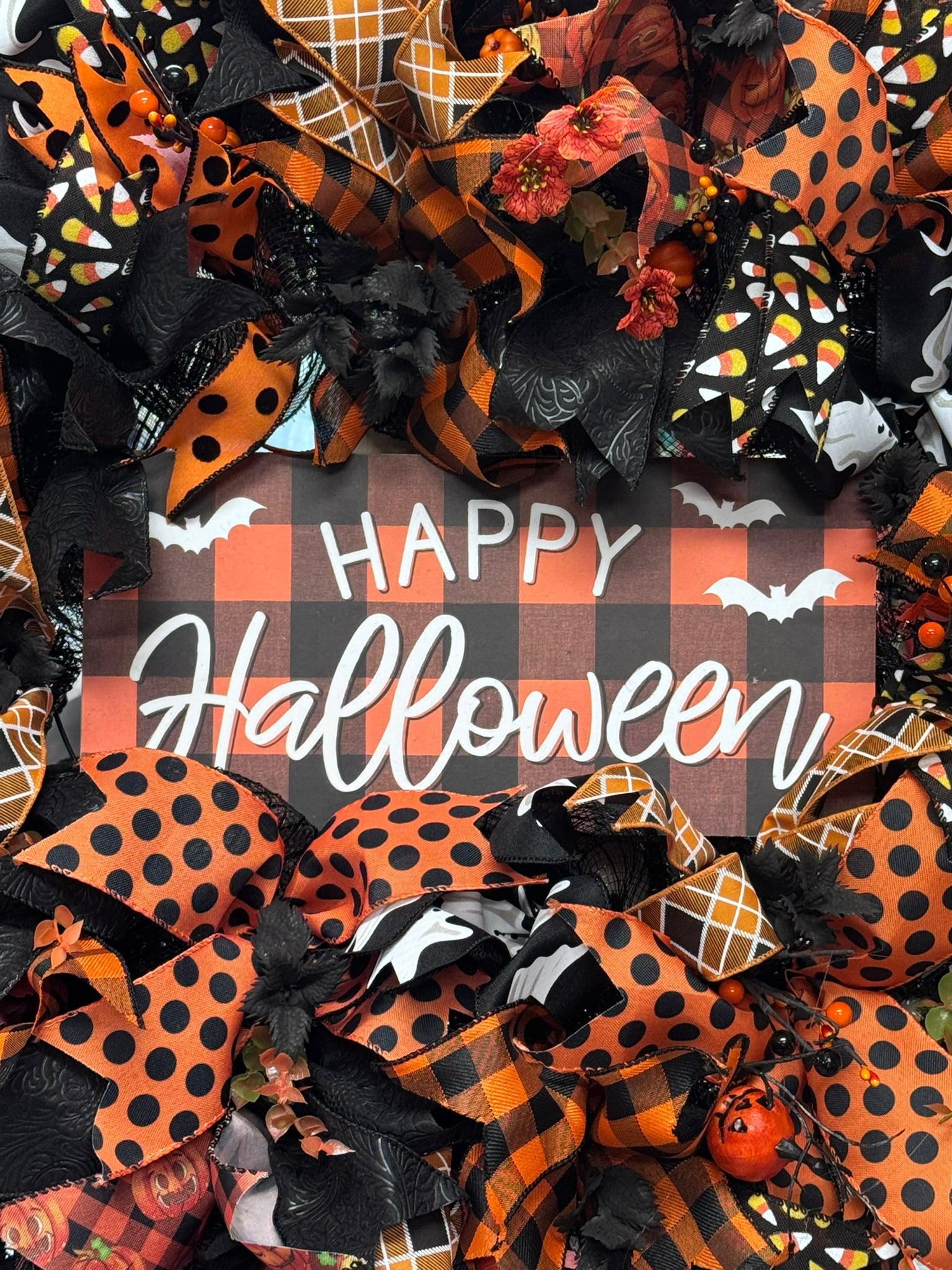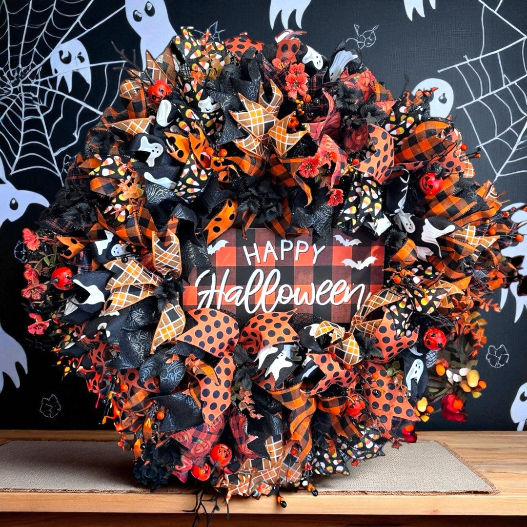 The Halloween Wreath by Christmas Plus More is a festive door decoration perfect for greeting guests and Trick Or Treaters to your home during the Halloween season. This artificial wreath features a buffalo plaid "Happy Halloween" sign, Orange and Black Ribbon with pip berries, black florals, & Jack-O-Lanterns. It is designed in orange and black colors, making it a unique and eye-catching addition to your seasonal décor. Made in the United States, this wreath is a must-have for anyone looking to bring a touch of Halloween cheer to their front door. Wreath