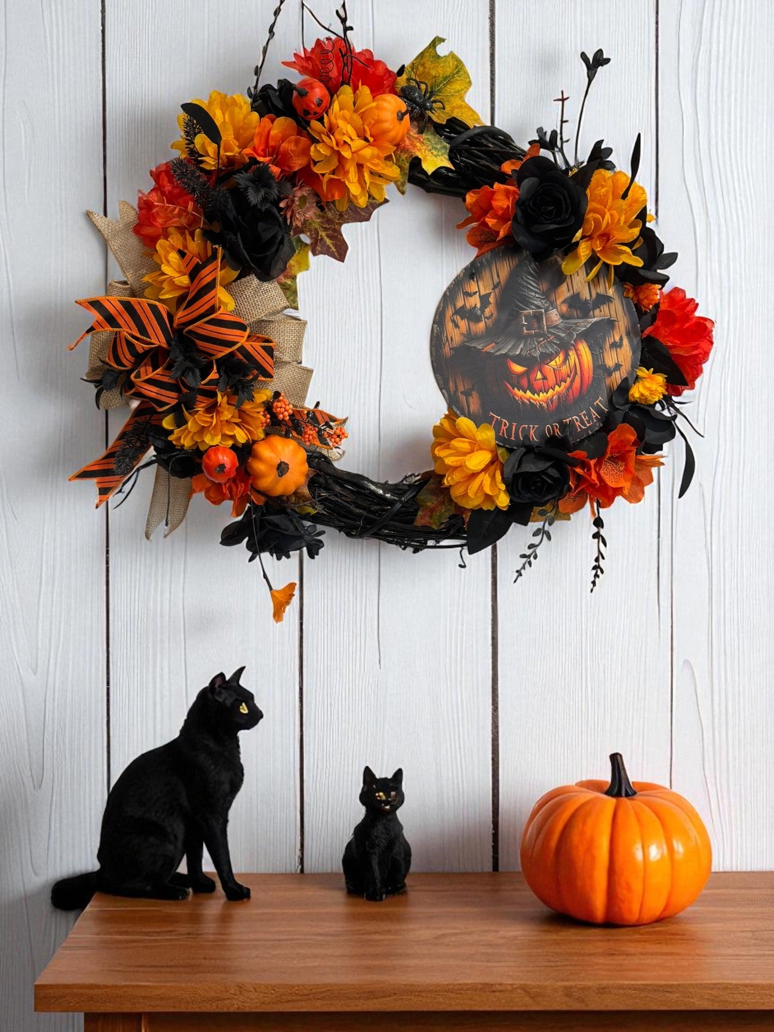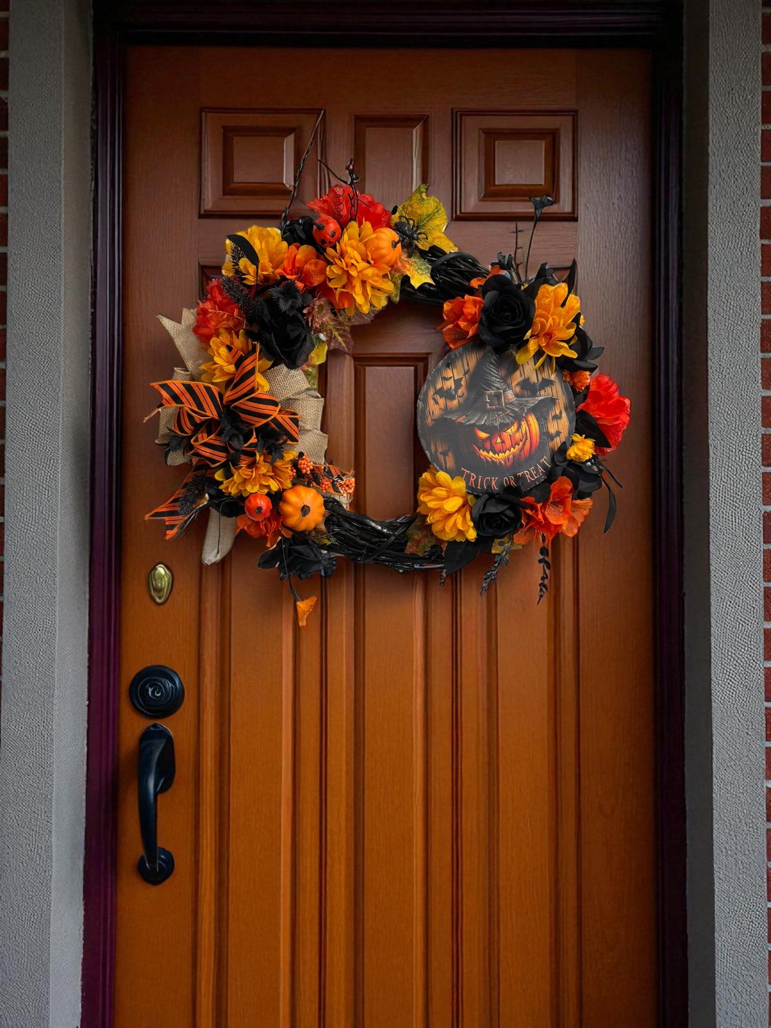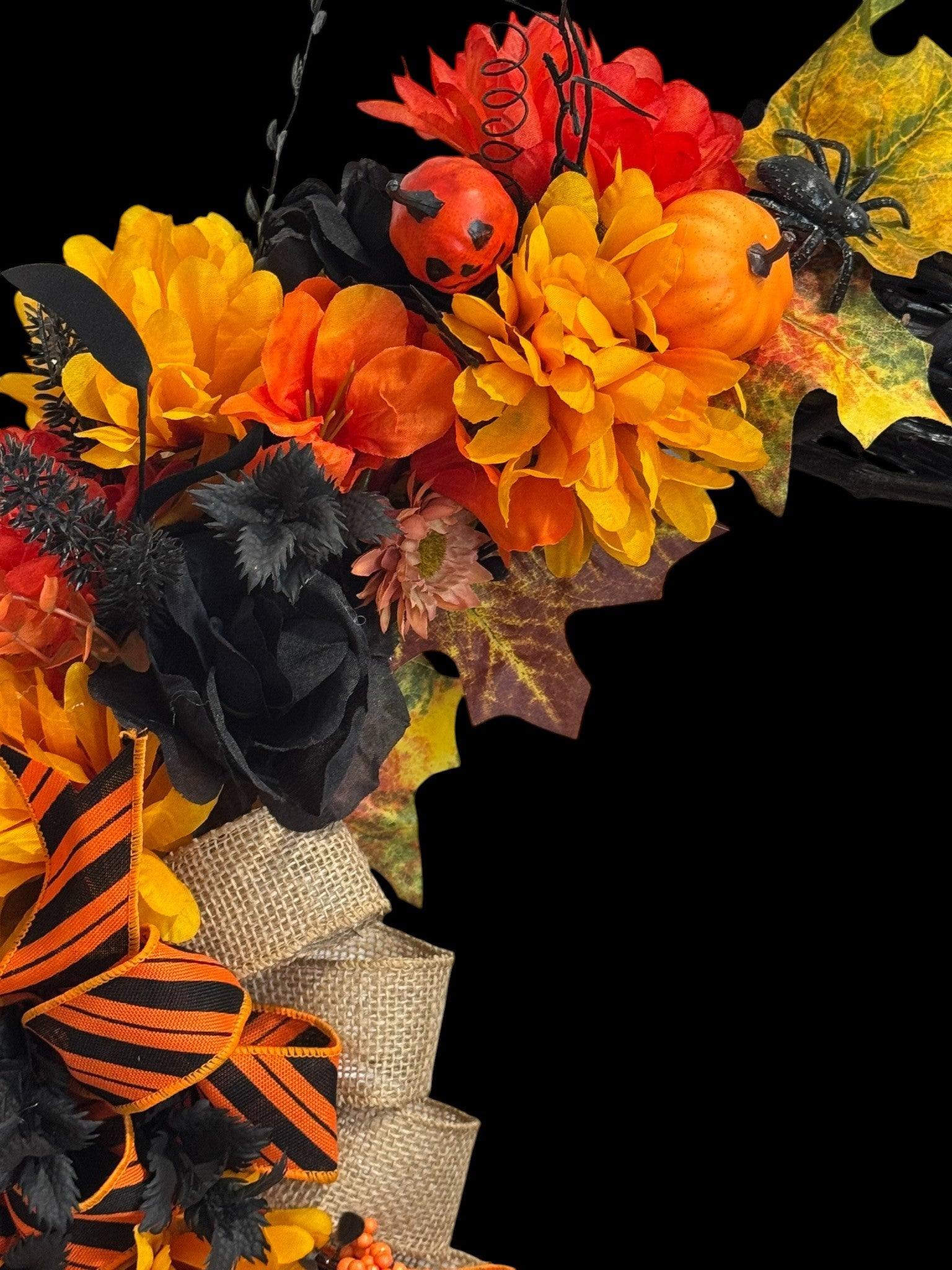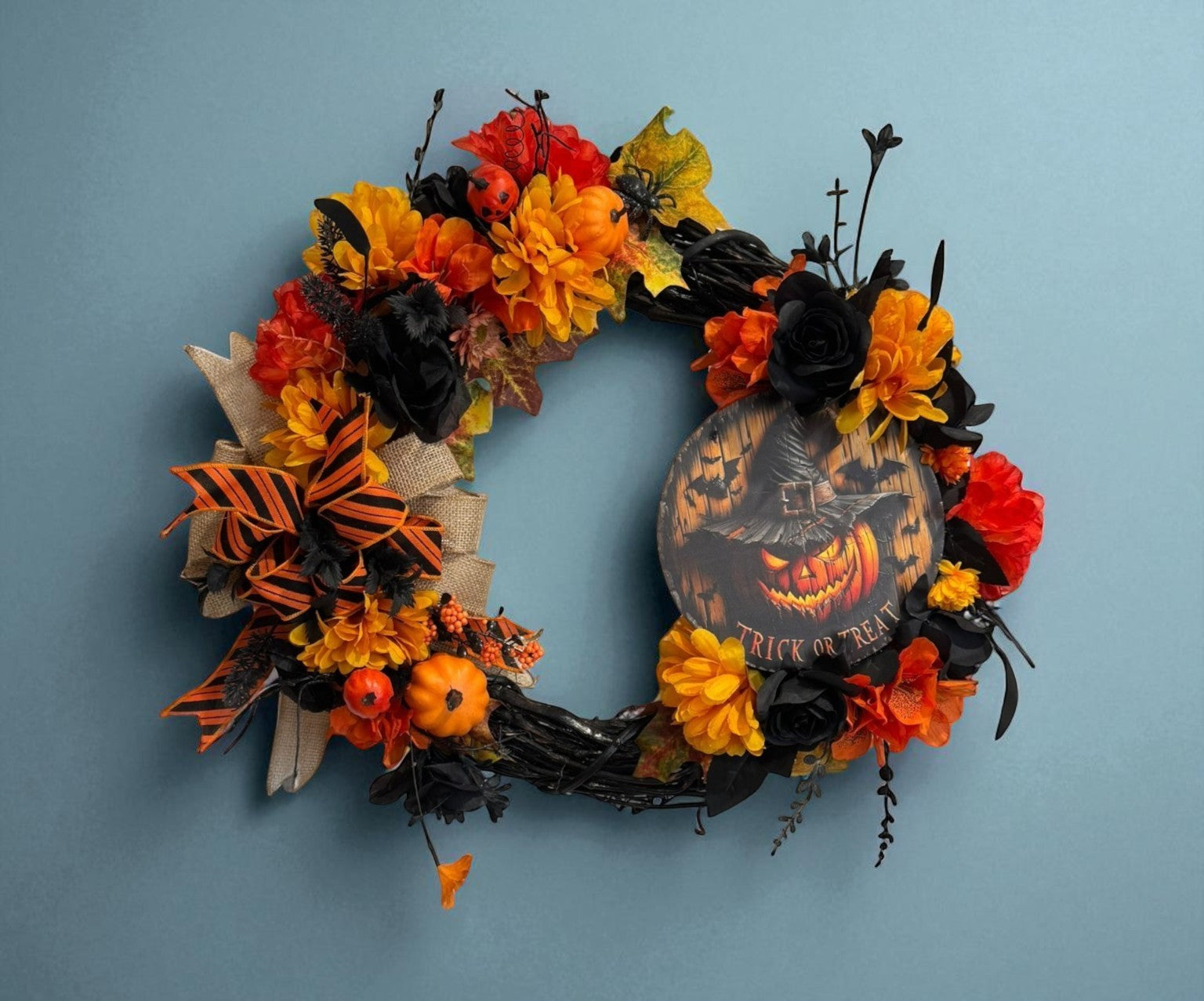 The Halloween Wreath by Christmas Plus More is a festive door decoration perfect for adding a spooky touch to your home during the Halloween season. This farmhouse style wreath features black roses, orange and yellow mums, spider, jack o lantern, and black floral pics. It is a unique and eye-catching addition to your seasonal décor. Made in the United States, this budget friendly wreath is a must-have for anyone looking to bring a touch of Halloween cheer to their front door. Wreath Measures 21x21x6inches.