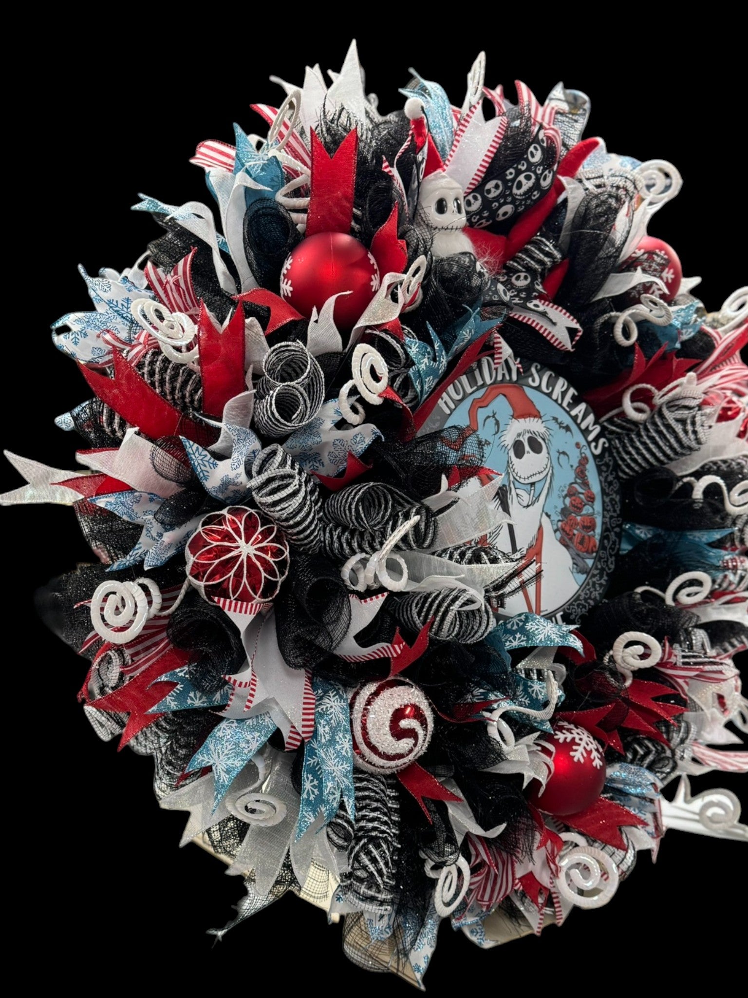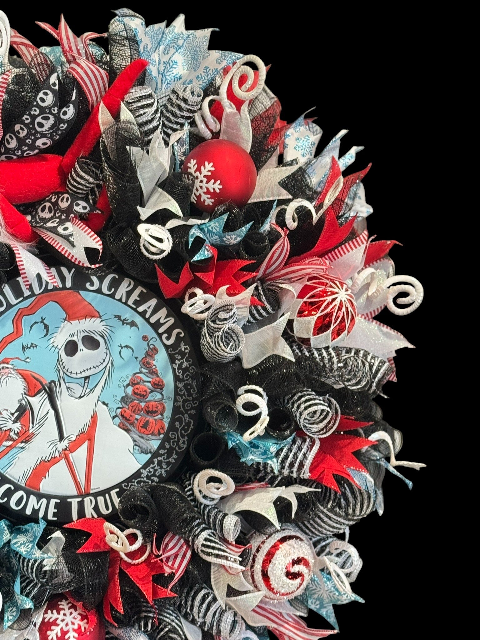 The Christmas Jack Skellington Inspired Swag Wreath is a festive and spooky addition to your front door decor. This red, blue & black wreath features a scary Christmas Jack theme, perfect for celebrating the occasion.  This wreath is 30 x 8 inches, it's very full with lots of detail, making it a striking statement piece for your home during the Halloween season.  This "Holiday Screams Come True" wreath is sure to delight guests and bring a touch of Halloween Jack Skellington cheer to your home.  Includes free shipping.