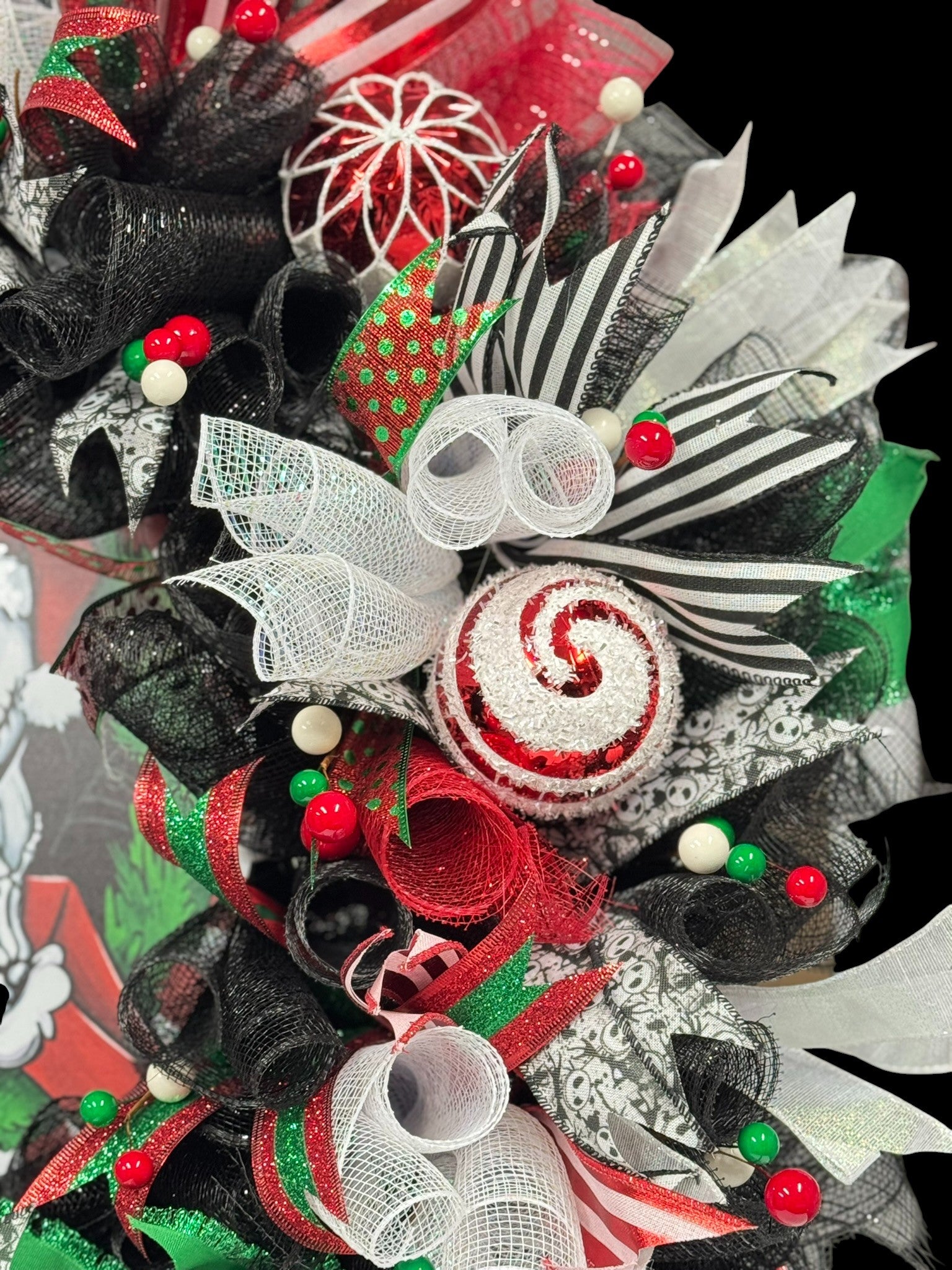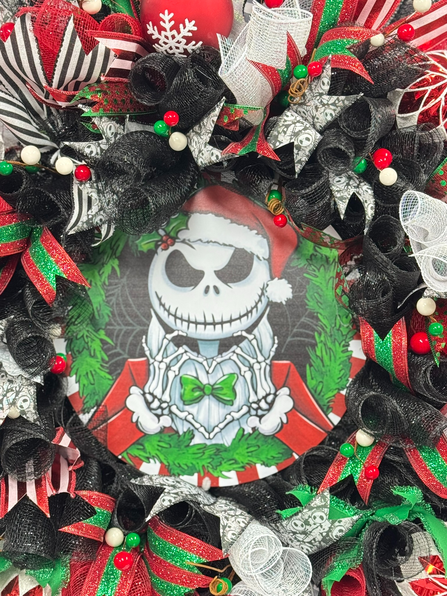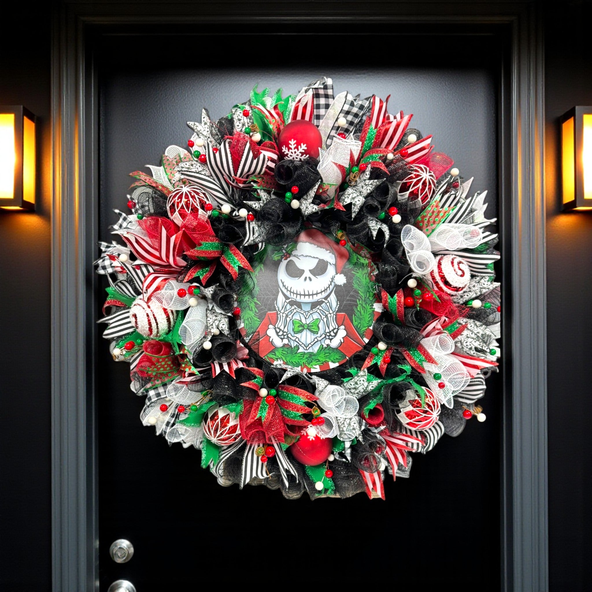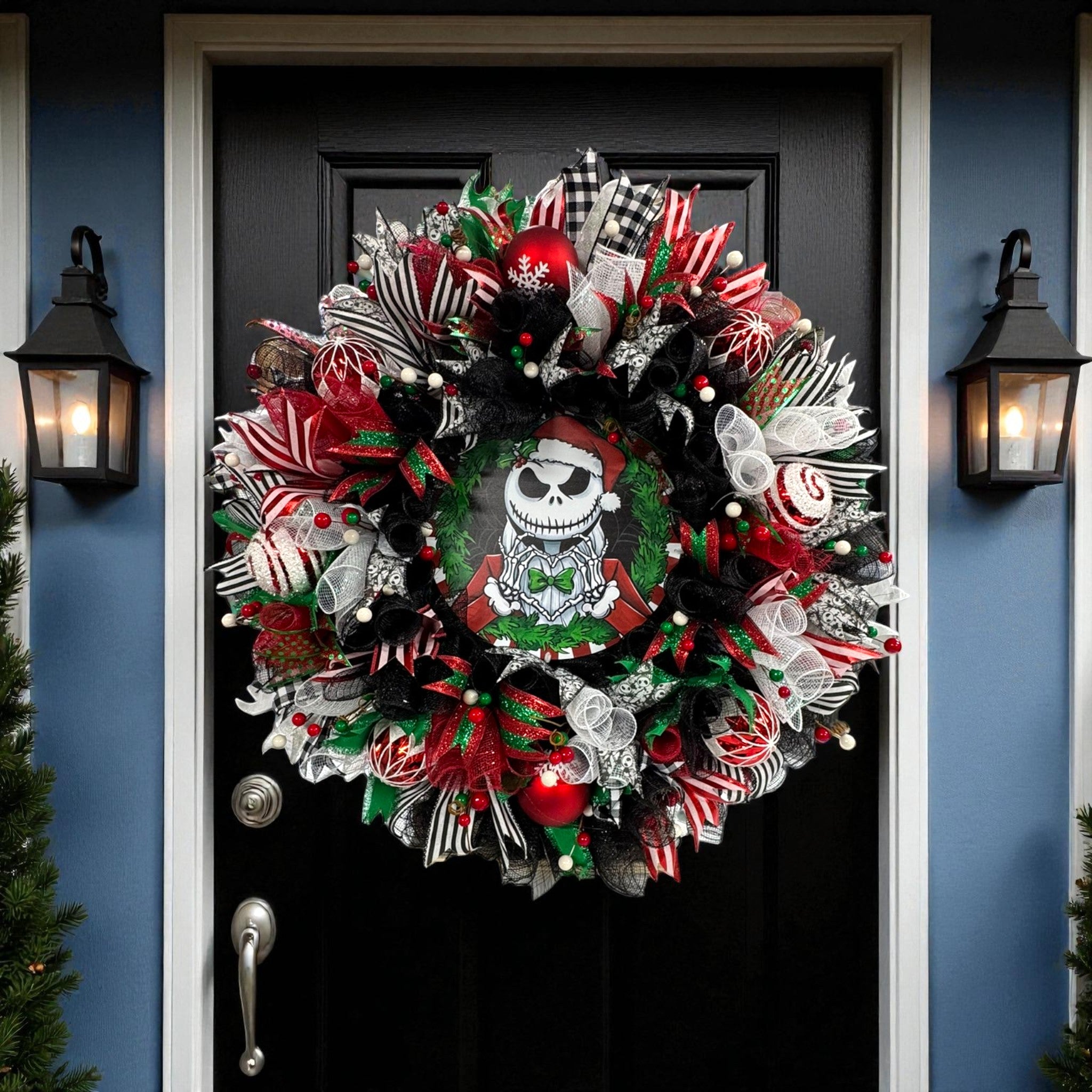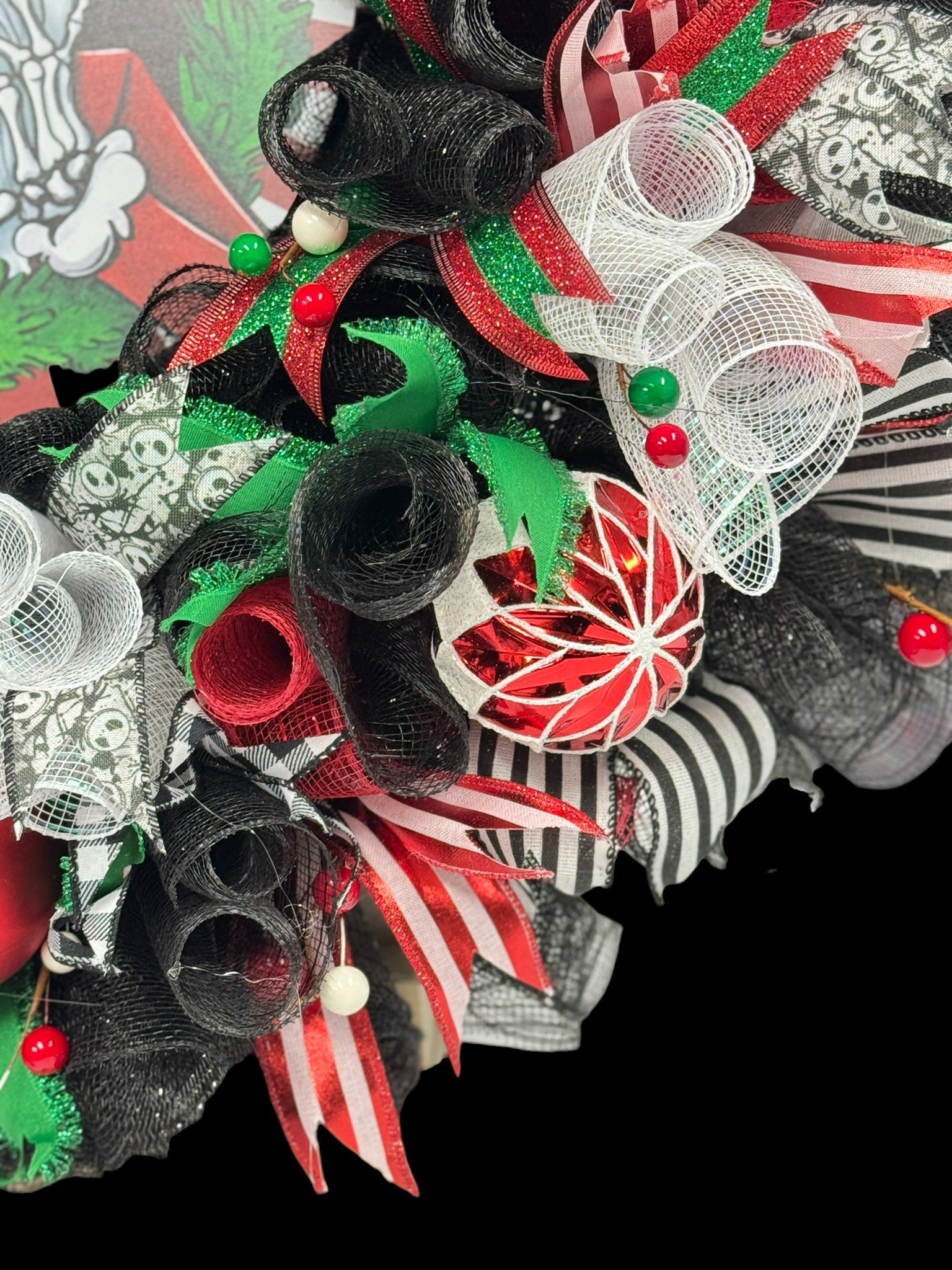 The Christmas Jack Skellington Inspired Swag Wreath is a festive and spooky addition to your front door decor. This red, green & black wreath features a Christmas Jack theme, perfect for celebrating the occasion. This wreath is 30 x 8 inches, it's very full with lots of detail, making it a striking statement piece for your home during the Christmas season. This Jack Skellington Merry Christmas wreath is sure to delight guests and bring a touch of Jack Skellington cheer to your home. Includes free shipping.
