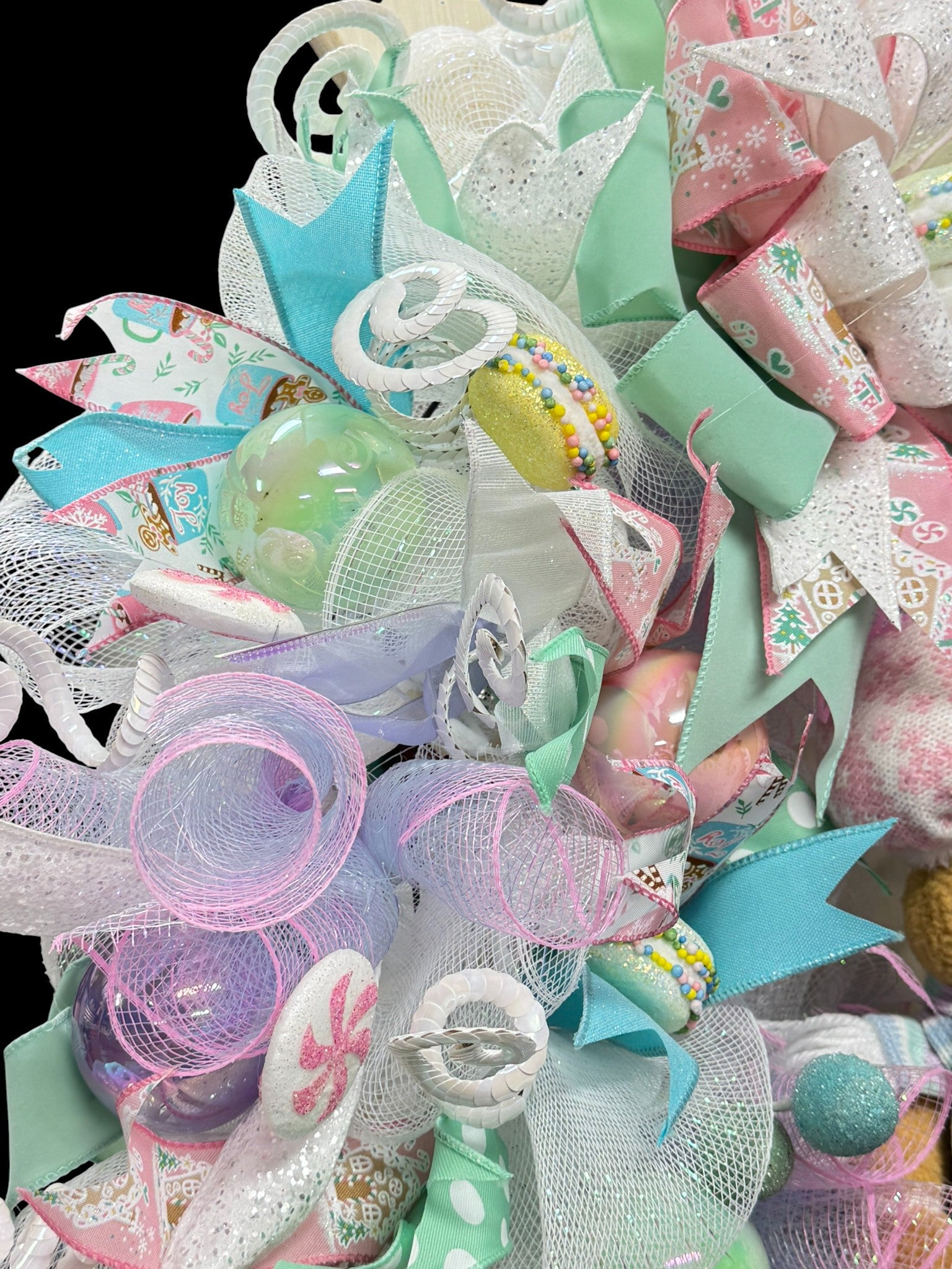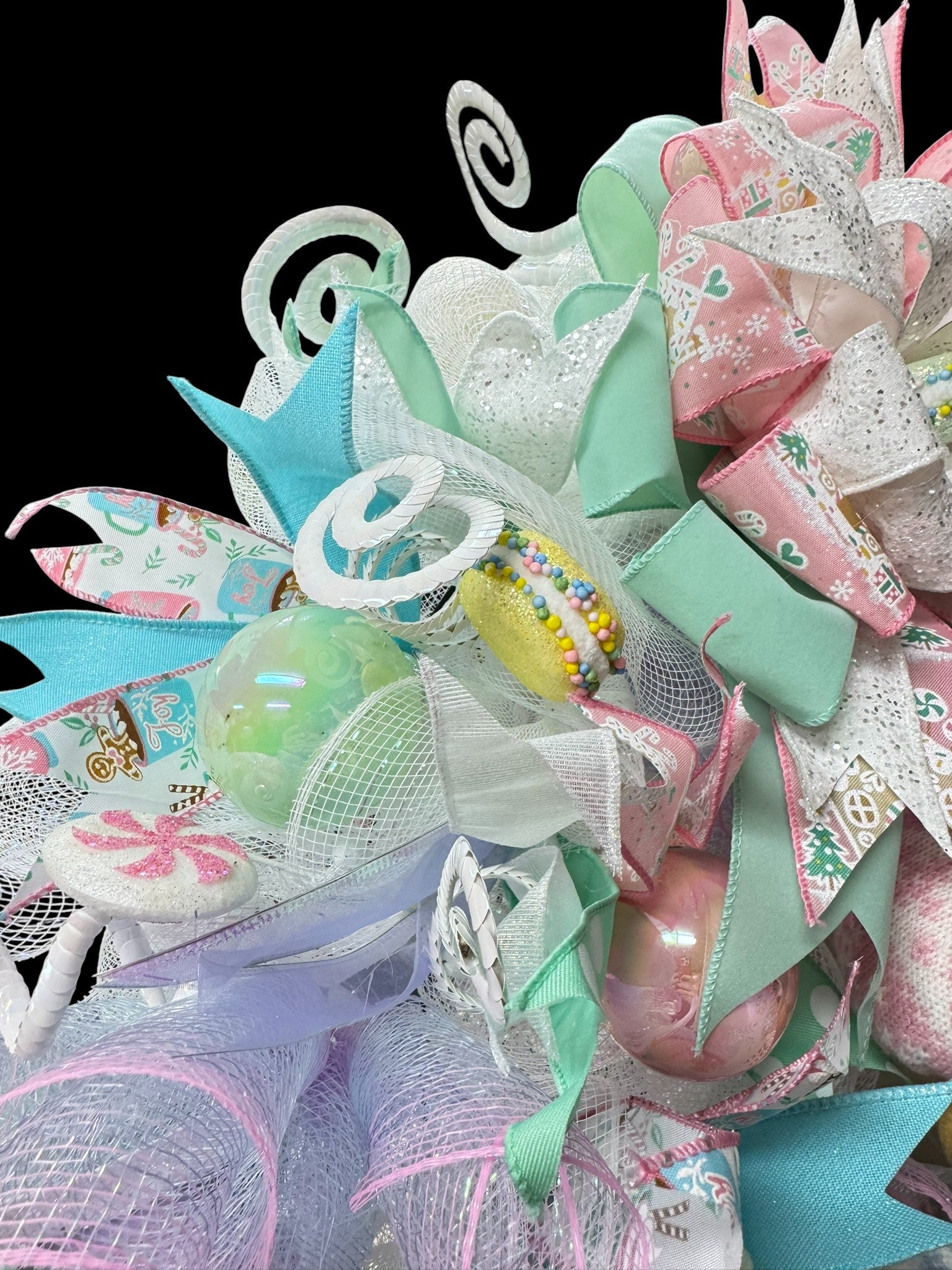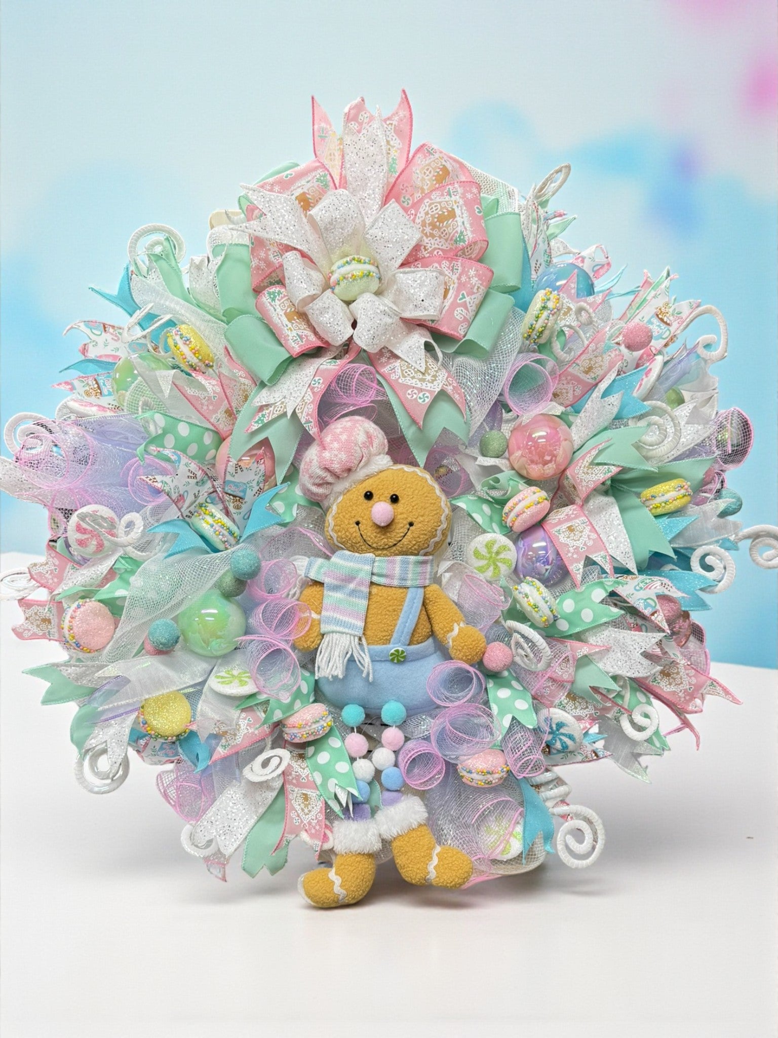 Pretty in pastel ! This pink Gingerbread wreath, by Christmas Plus More is beautiful with it's festive Gingerbread Man with is Pink Hat, Pastel candy picks, Beautiful Gingerbread House Bow and Pastel Ornaments. measures 26x26x7 inches and is a handmade creation by Christmas Plus More.