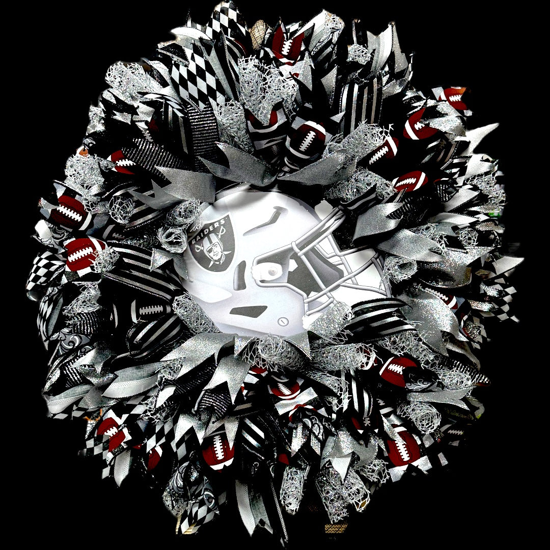 A beautiful and festive Las Vegas Raiders inspired wreath. It is adorned with a Raiders Helmet Sign, deco mesh and silver and black ribbons. It measures 27 inches and would be a great addition to your front door.