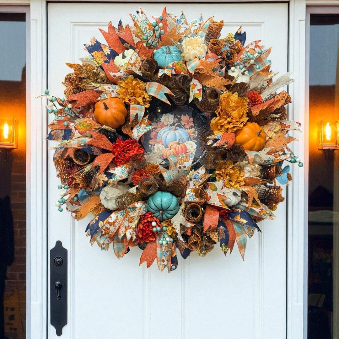 Not into Halloween? Beautiful and Country Farmhouse Fall Wreath. A Floral Artist created Front Door Wreath made of orange, teal, & white pumpkins with ribbons, fall artificial flowers and berries This wreath measures 27 inches x 27 inches.